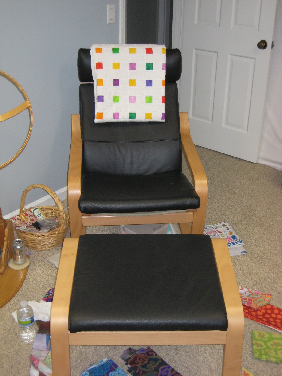 My throne! Two little charity quilts to be basted, quilted, and bound.
